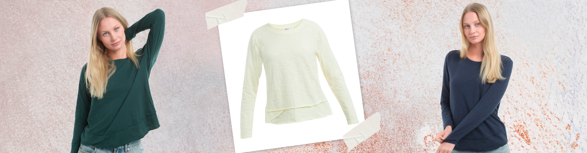 The pieces that end up offered in the most colors are the ones whose construction has settled into something finished. The Mock Layer Tee works because the layered hem adds dimension without weight. The 3/4 Sleeve V-Neck Shirttail works because the raw hem and the v-neck are doing complementary things, one relaxed, one slightly dressed, without either overpowering the other. The Baby Fit Long Sleeve works because the shrunken crew sits cleanly at the neck, and the fit is close without being tight.
